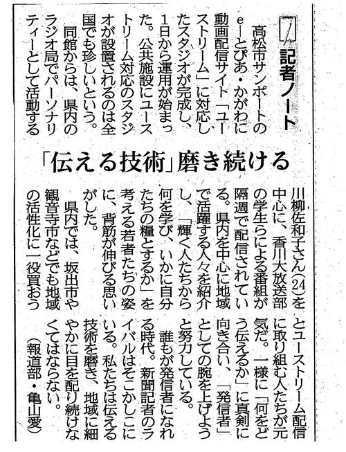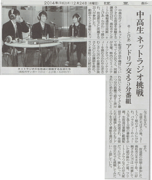 2014/12/28 四国新聞に体験ワークショップ「インターネットで生放送をはじめよう!」の記事が掲載されました。